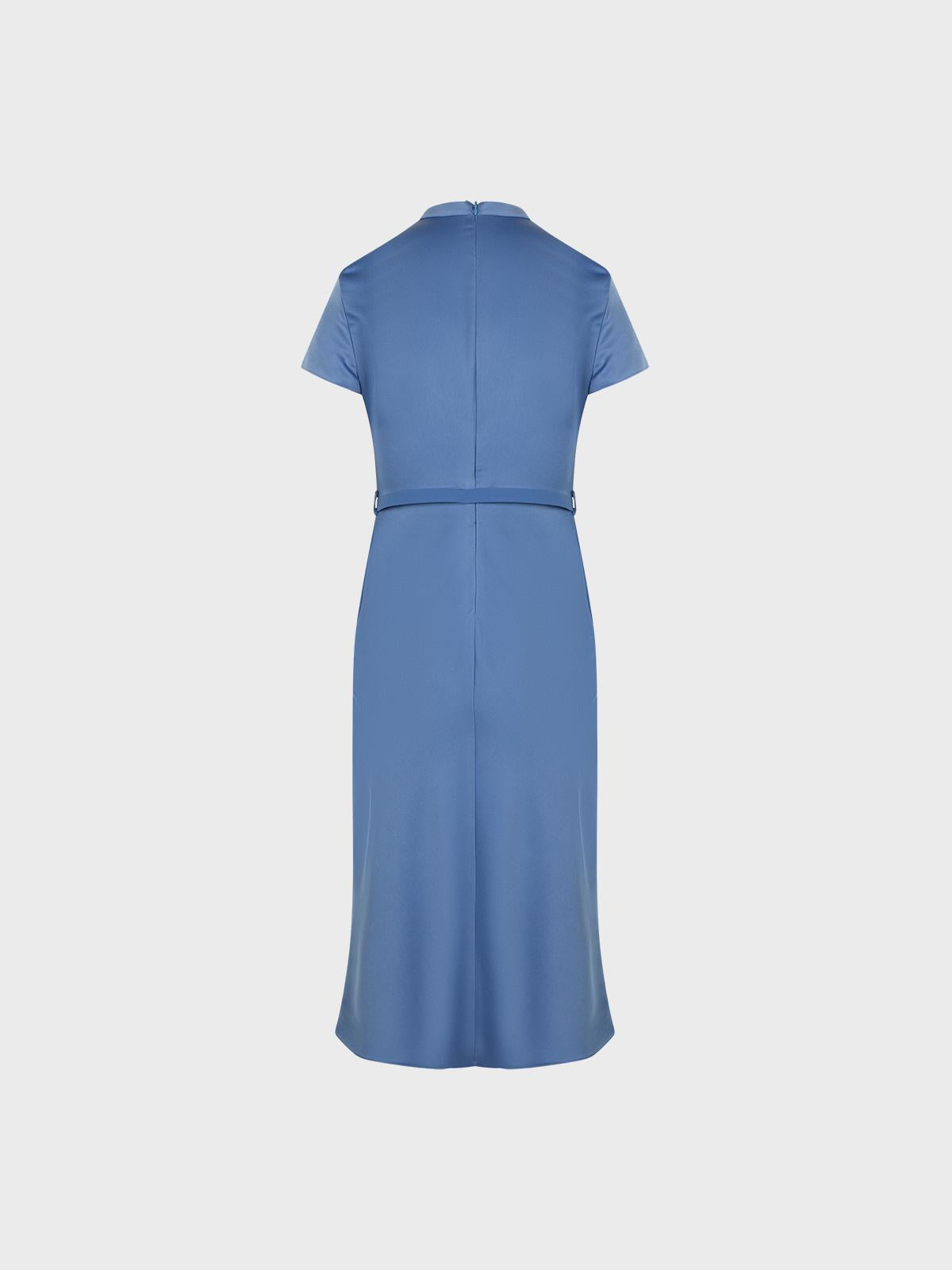 Abito in enversatin con gonna tagliata sbieco,maniche corte e collo lupetto con arricciatura
