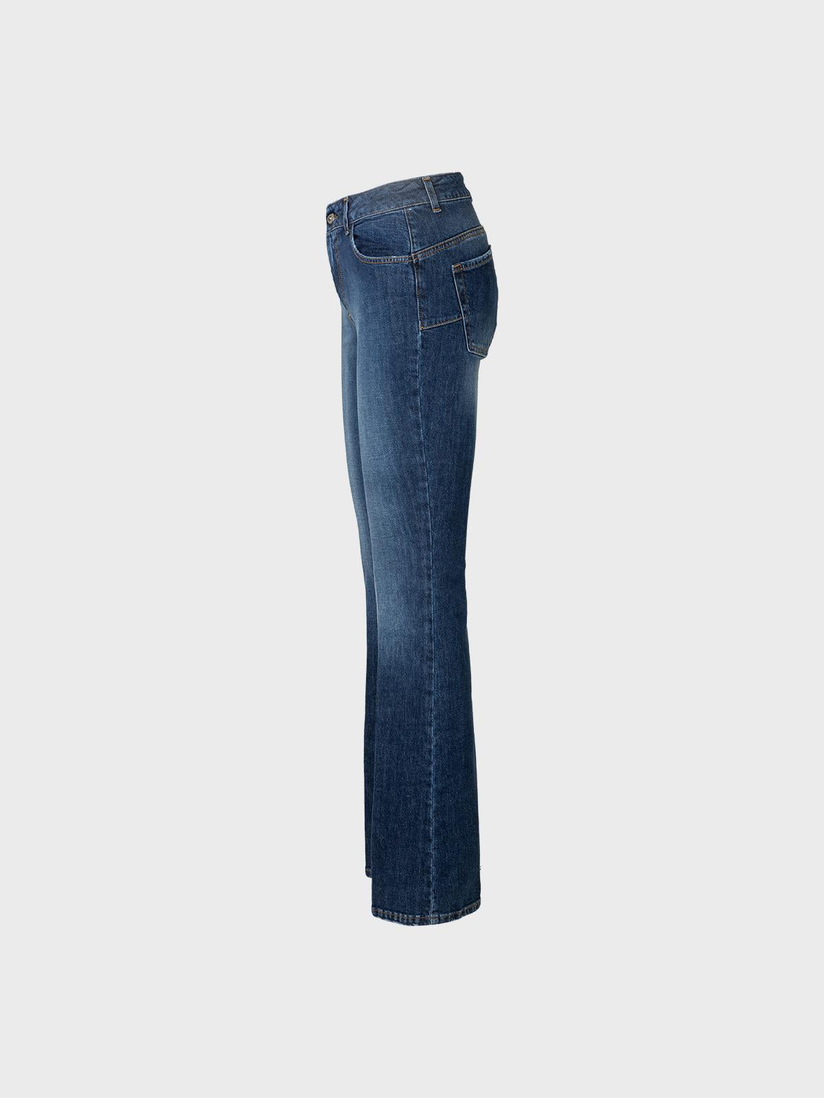 Pantalone cinque tasche in denim comfort di linea a zampetta con molature su tasche e orlo