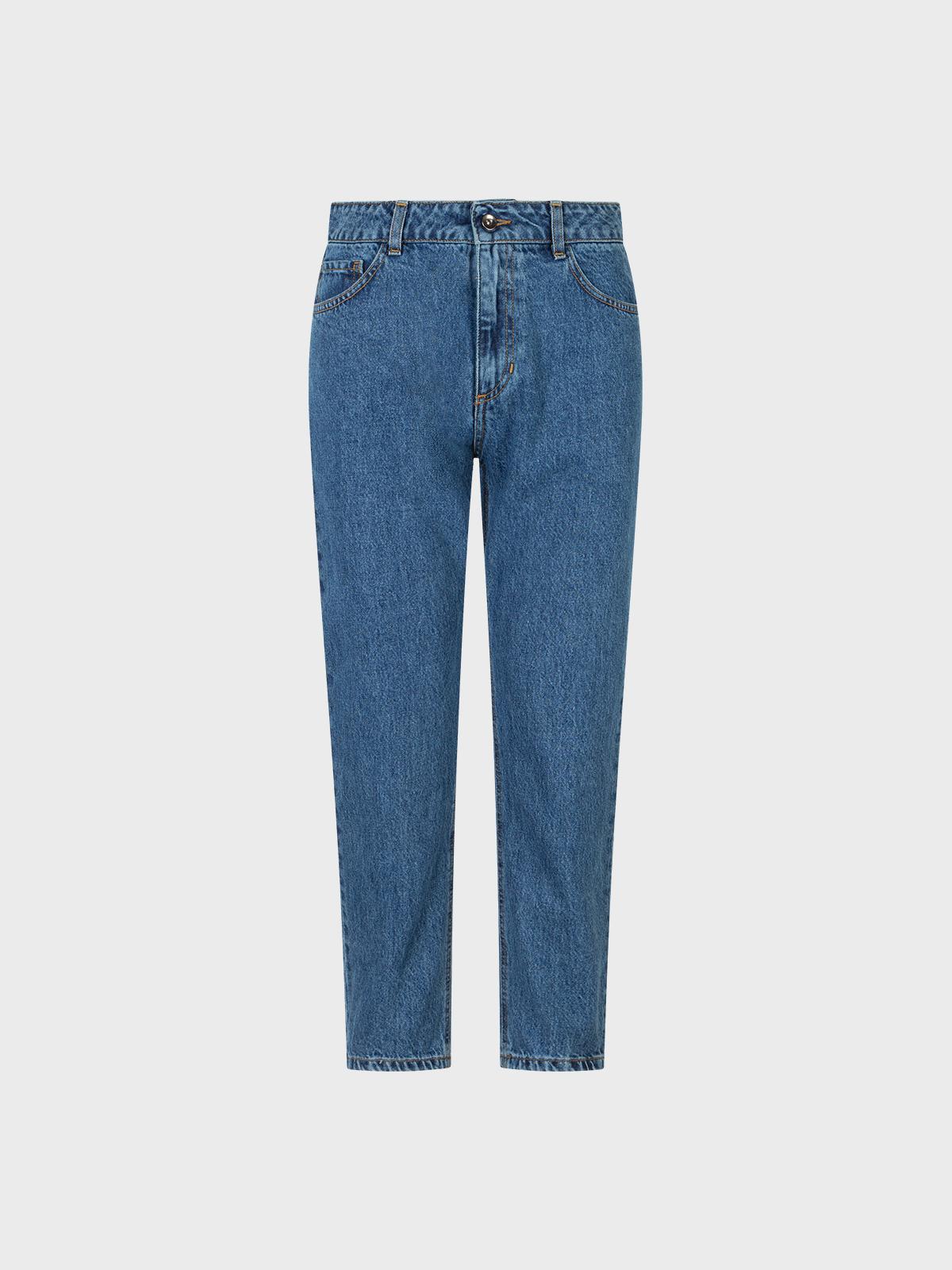 Pantalone cinque tasche boy fit in tela denim con molature su tasche e orlo