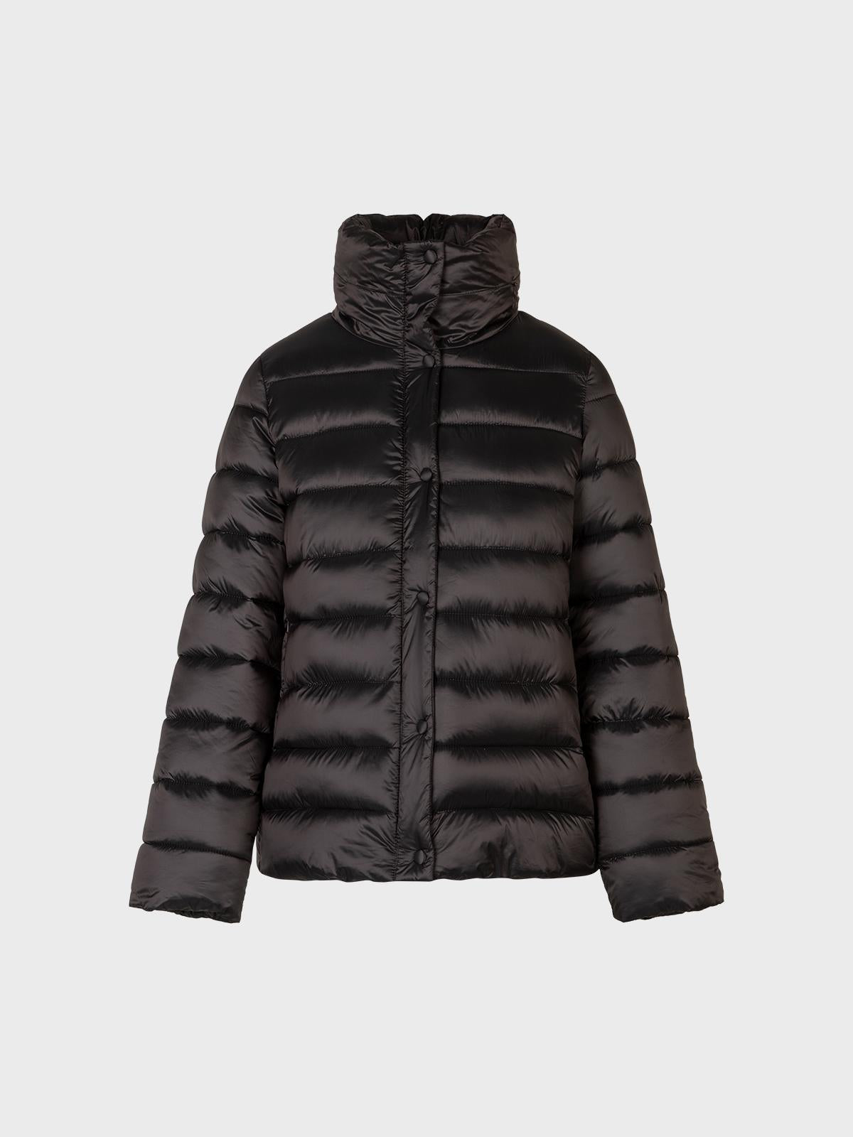 Piumino corto in nylon cangiante con zip nascosta e bottoni automatici ricoperti e cappuccio estraibile dal collo