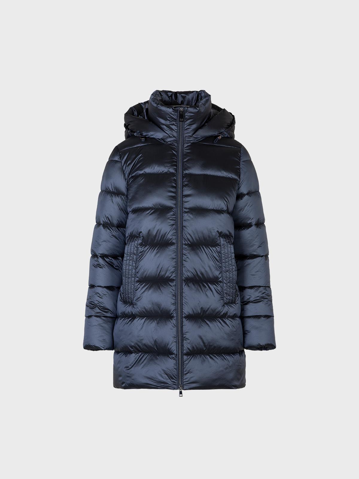 Piumino lungo con zip centrale,tasche a filetto e cappuccio con coulisse staccabile